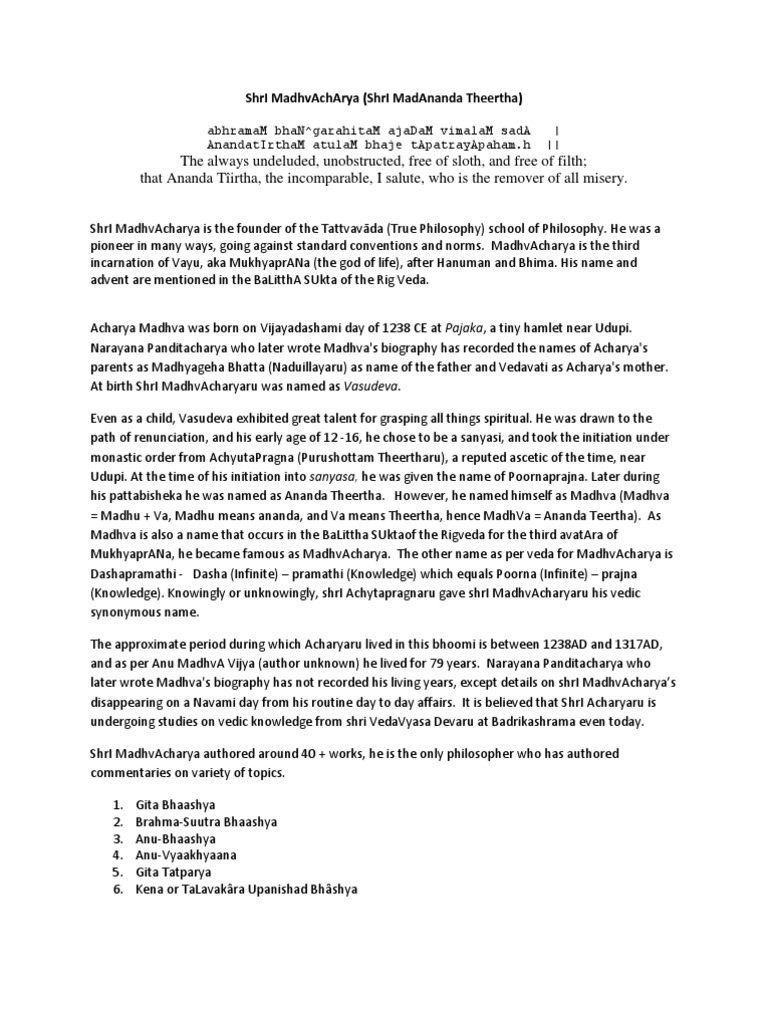Madhvacharya Philosophy / He was born of madhya geha and vedavati.